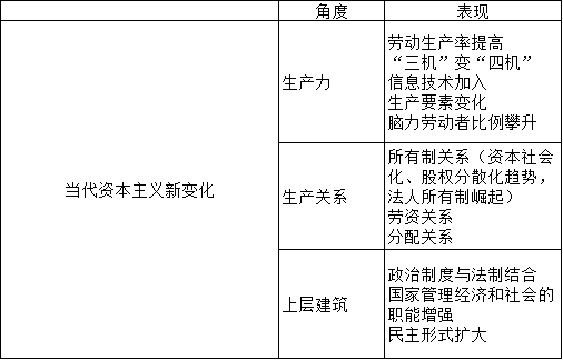 (1)从生产力方面看。 战后发达资本主义国家,在生产力方面取得了长足的发展,劳动生产率大幅度提高, 社会财富迅猛增长,经济保持了较长时期的相对稳定发展。 (2)从生产关系方面看。 当代资本主义国家在所有制关系、劳资关系和分配关系三方面都做了一系列调整。 (3)从上层建筑方面看。 资本主义发展到国家垄断资本主义阶段,已经建立起比较成熟的政治制度和法制制度。