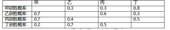 [单选题]某次网球比赛的四强对阵为甲对乙,丙对丁,两场比赛的胜者将争夺冠军.选手之间相互获胜的概率如下