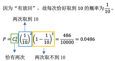 [简答题]从数字1,2,…,10中有放回地任取4个数字,则数字10恰好出现两次的概率为___________.