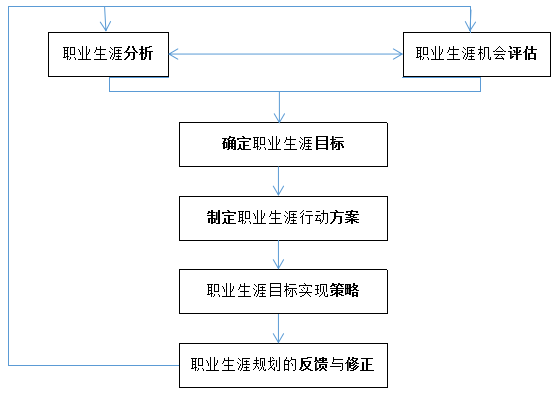 ①职业生涯分析。②职业生涯机会评估。③确定职业生涯目标。④制定职业生涯行动方案。⑤职业生涯目标实现策略。⑥职业生涯规划的反馈与修正。