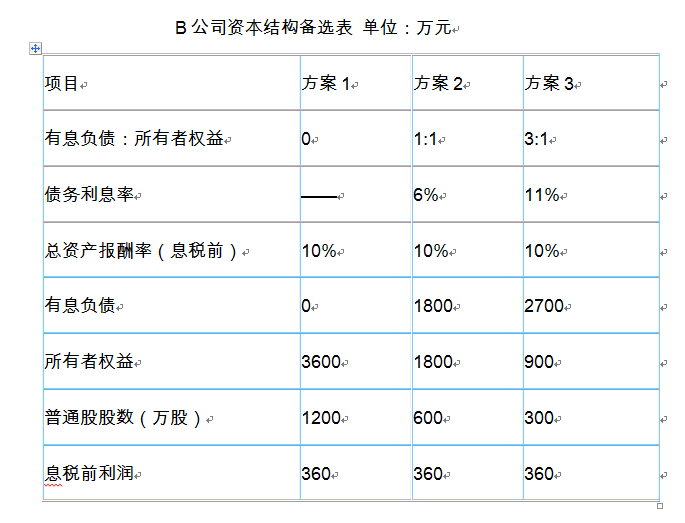 [综合题]A公司欲设立一全资子公司B,通过实地考察,B公司开业运营需要资金3600万元,预计其总资产报酬率(息税前)为10%,拟定的资本结构备选方案和相应债务利息率如下表所示,在每种资本结构备选方案中,股权资金由A公司投入,债务资金以B公司的名义筹集。