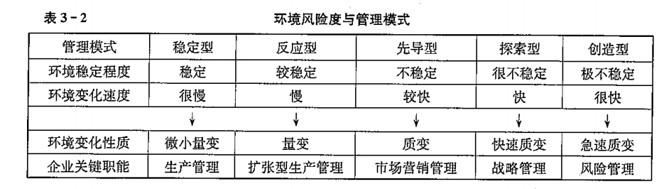 美国战略学家安索夫曾根据变化的速度和深度将环境的风险度划分为五类,并提出了与之相适应的五类管理模式(见表3-2)。