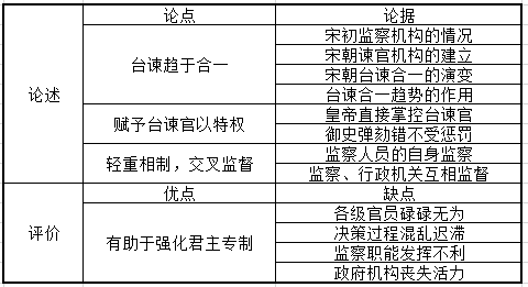 (4)宋代的监察网络密集,适应了强化君主专制集权的需要,但也带来了弊端,表现在很多官员不求有功,但求无过,因循苟且,对相权的威慑使决策过程混乱、迟滞。各职能机构的混淆和相互抵牾不利监察职能的发挥,也使得政府丧失活力。