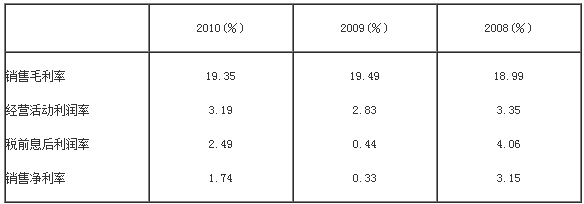 另外,年报数据表明该公司2009年度销售收入下降;管理当局讨论书披露管理费用5.4亿,和前一年基本保持一致,但管理费用占销售收入的比重由2008年的3.6%上升到2009年得3.9%。