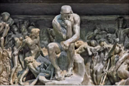 本题考查的是雕塑的相关知识。《思想者》最初是为《地狱之门》一件庞大的雕塑构图所作的小稿。《思想者》居于《地狱之门》的中心位置。题材取自于但丁《神曲》的《地狱篇》。它塑造了一个强有力的劳动男子。雕塑人物全身赤裸,腰身微弓,左手在左膝上自然放置,右腿支撑着右臂,右手脱在有着凌厉线条的下巴,握紧的拳头用力地顶在嘴唇上,本身就十分健美的肌肉此时更是紧张地隆起,露出饱满的线条,雕像形象虽然是静止的,但似乎显示出他在进行着高强度的劳动。他神态庄严肃穆,似在审视着宇宙中的一切。因此,图片中作品的名称为《思想者》。D项正确。