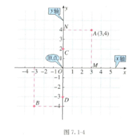 有了平面直角坐标系,平面内的点就可以用一个有序数对来表示了。例如,如图7.1-4,由点A分別向x轴和y轴作垂线,垂足M在x轴上的坐标是3,垂足N在y轴上的坐标是4,我们说点A的横坐标是3,纵坐标是4,有序数对(3,4)就叫做点A的坐标,记作A(3,4)。类似地,请你写出点B,C,D的坐标:B(__,__),C(__,__),D(__,__)。