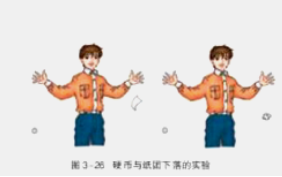 我们来做一个简单的实验,如图3-26所示,一手拿小纸片,另一手拿硬币,双手举至相同高度,然后同时松手,看看纸片与硬币谁先落地。将纸片捏成纸团,结果又怎样?为什么硬币比纸片先落地?为什么纸片捏成纸团后,下落快些?你能说出原因吗?再用其他物品试试,你能由此得出什么结论?