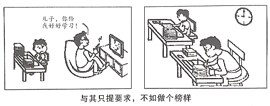 毫无疑问,图画向我们阐释了榜样的重要性。一个好榜样的力量是无穷的,在父母与子女的关系中尤为如此。家庭是最基本的教育单位。在这一教育单位中,父母是孩子的启蒙老师,应以身作则。一方面是因为孩子喜欢模仿成人,而他们的思维又以具体形象为特点,所以,为孩子做出效仿的榜样会更有成效。另一方面是因为行动比语言更有说服力。倘若父母提出各种连他们自己都无法达成的要求,他们又怎能要求孩子照做呢?