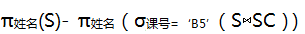 [简答题]设有两个关系:学生关系S(学号,姓名,年龄,性别)和选课关系SC(学号,课号,成绩),试用关系代数表达式检索没有选修B5课程的学生姓名。