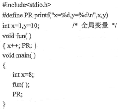 PR是宏名,在之后函数中出现的PR都将用printf(“x=%d,y=%d\n”,x,y)替代,int x=1,x=10定义的是全局外部变量x,y。