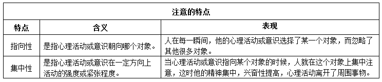 注意的两个特点: (1)指向性。指向性是指心理活动或意识朝向哪个对象。人在每一瞬间,他的心理活动或意识选择了某一对象,而忽略了其他很多对象。
