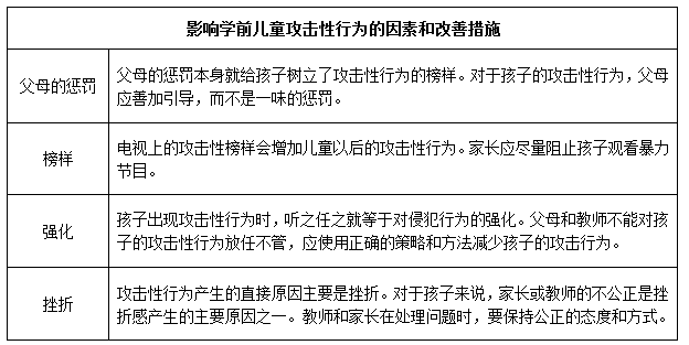 本题考查了学前儿童攻击性行为的特点、影响因素和改善策略。学前儿童攻击性行为的特点可围绕关键词“频繁、身体攻击、向敌意性攻击转化、性别差异”组织记忆。对于改善策略要结合影响因素论述。可参考下表: