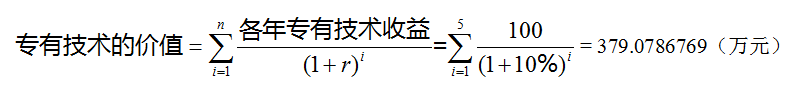 [单选题]被评估的专有技术自评估基准日起剩余使用年限为5年,经专业人员分析,未来5年预期税后收益可维持在每年100万元,若折现率为10%,则该专有技术的评估值约为()