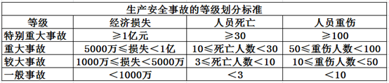 (2)2007年4月国务院颁布的《生产安全事故报告和调查处理条例》规定,根据生产安全事故造成的人员伤亡或者直接经济损失,事故一般分为以下等级: