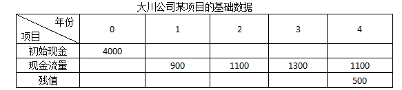 本题考核净现值的计算。由于第四年残值为500,属于现金流入,因此第四年的净现金流量应该为1100+500,参照复利系数表,NPV=-4000+900×(P/F,i,1)+1100×(P/F,i,2)+1300×(P/F,i,3)+(1100+500)×(P/F,i,4)=-4000+900*0.9091+1100*0.8264+1300*0.7513+1600*0.6830=-203.28,故本题选B。