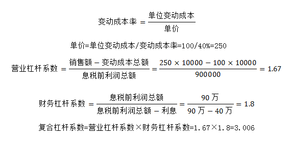[简答题]某企业本年度只经营一种产品,息税前利润总额为90万元,变动成本率为40%,债务利息总额为40万元,单位变动成本100 元,销售数量为10 000台,试求营业杠杆系数、财务杠杆系数、复合杠杆系数。
