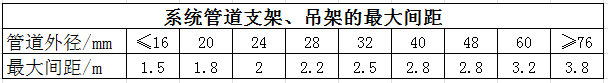 细水雾灭火系统的管道固定安装要求规定,系统管道支架、吊架的最大间距如下表: