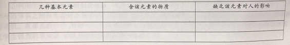 [社会导入]我们在看电视的时候,经常看到劝人们“补铁”“补钙”的广告,这里的“铁”“钙”指的就是元素,类似这样的元素你还知道哪些?请分组讨论并填写下表。