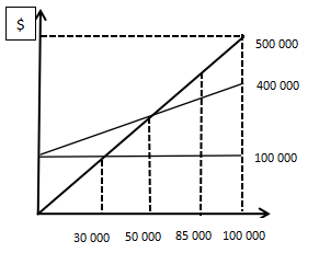 盈亏平衡点是指利润为0。由图可知当产量为50000时收入=成本,即利润为0,选C。