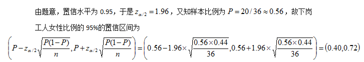 [单选题]为调查某地区下岗工人中女性的比例,随机抽取了36个下岗工人,其中20人为女性,以95%的置信水平估计该地区下岗工人中女性比例的置信区间为( )(