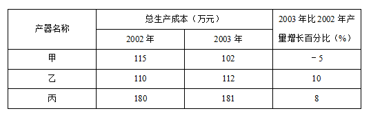 [综合题]为保持产品的市场竞争力,安康家具制造公司在保证产品质量的同时尽可能降低生产成本,为此,公司一方面在降低管理费用上下功夫,另一方面致力于提高产品产量。下面是公司2002年和2003年三种主要家具的生产数据: